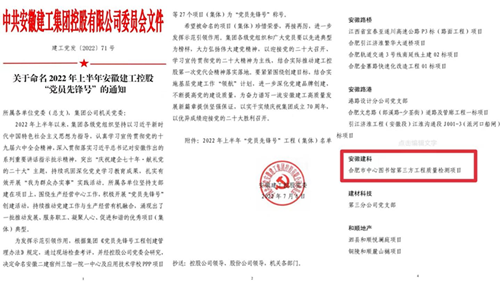 近日,從集團傳來喜訊,我院合肥市中心圖書館第三方工程質量檢測項目被安徽建工控股黨委授予“黨員先鋒號”稱號。